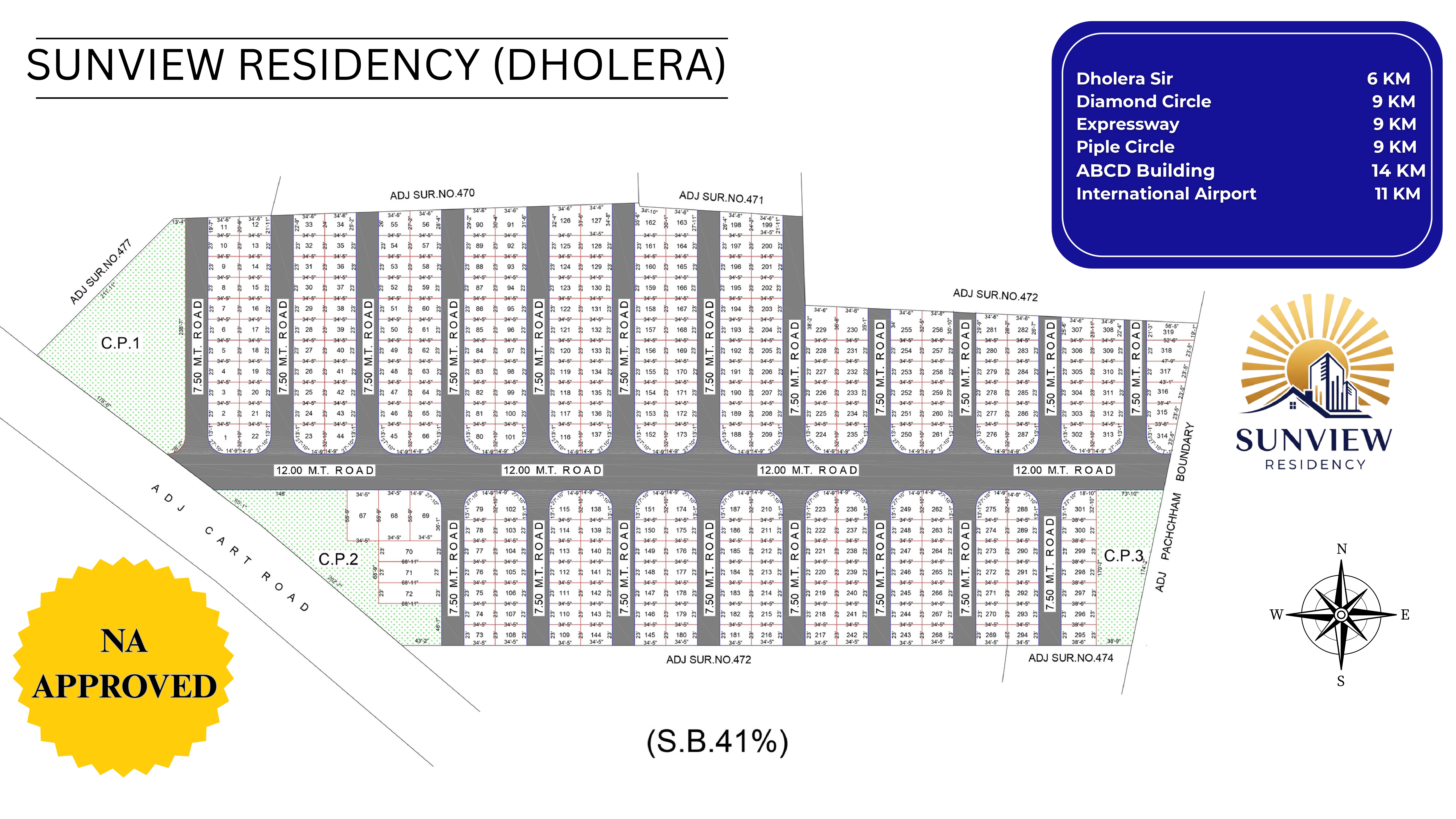 Sunview Residency is located on upcoming Gambh-Fatehpur Metal Road in near vicinity to the upcoming green field smart city- dholera having its own international airport, High Speed Metro from Ahmedabad and fully AI controlled area with number of salient features already given in dholera section.